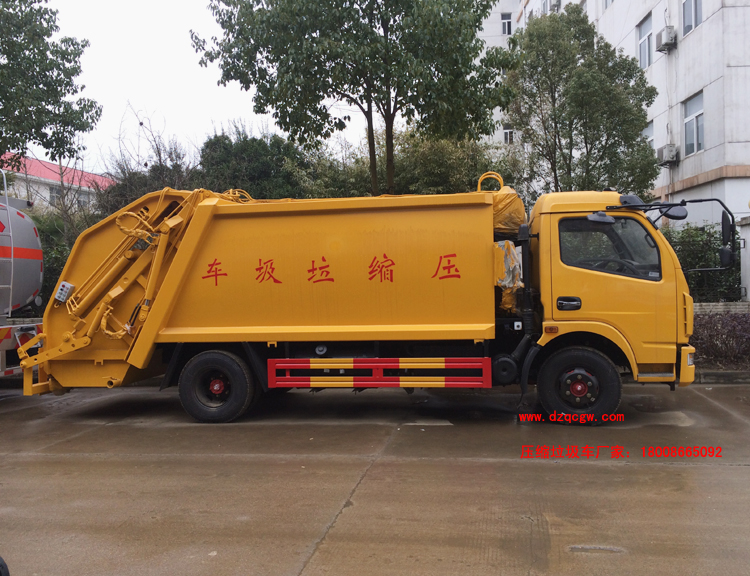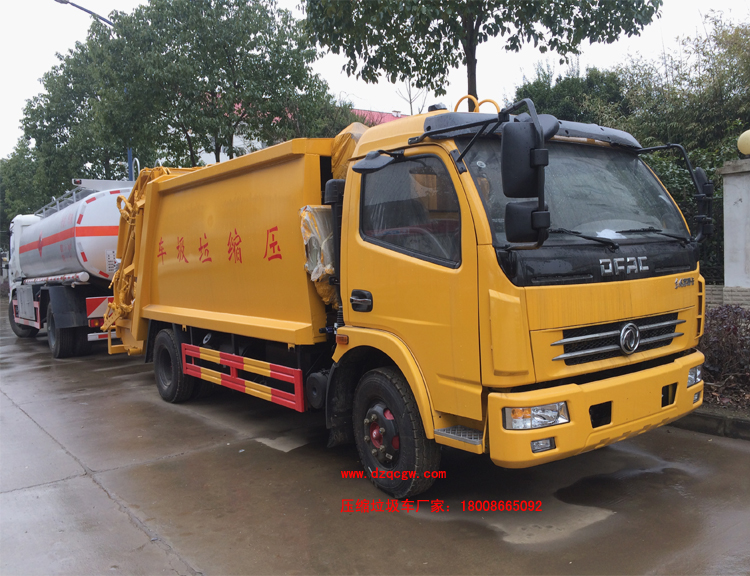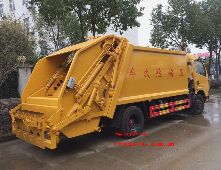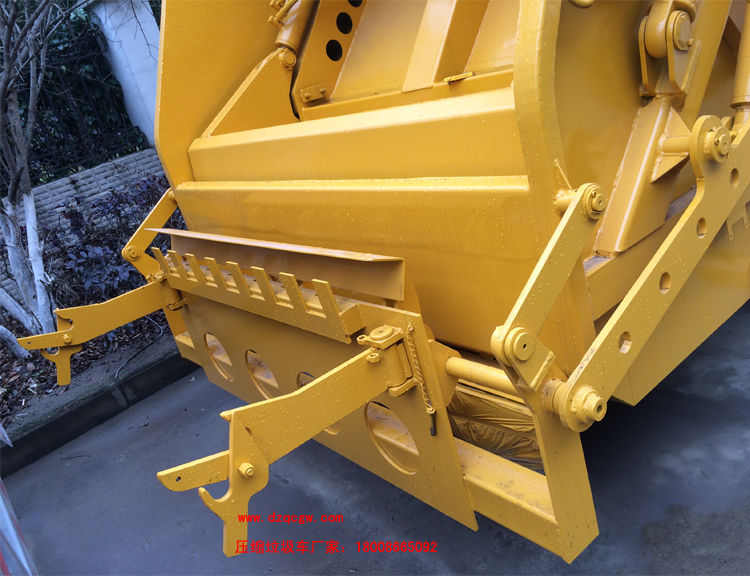 廂體材料為武鋼優質炭鋼,厚度為邊5mm,廂體容積為7-8立方米。由裝料機構、壓縮機構、卸料機構、油泵、油箱、控制閥等組成的液壓機構組成。裝料機構由支架、連桿機構、凸輪、掛鉤等組成,在油缸作用下,將垃圾桶內的垃圾自動翻轉倒入料斗內。新款有9支液壓缸制動,不帶副壓板,液壓控制操作系統為電動控制和手動控制。