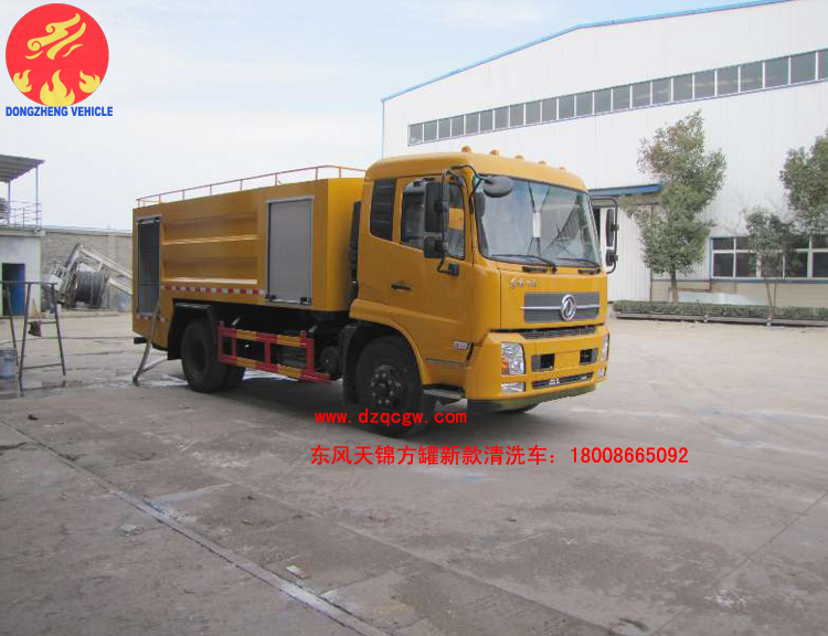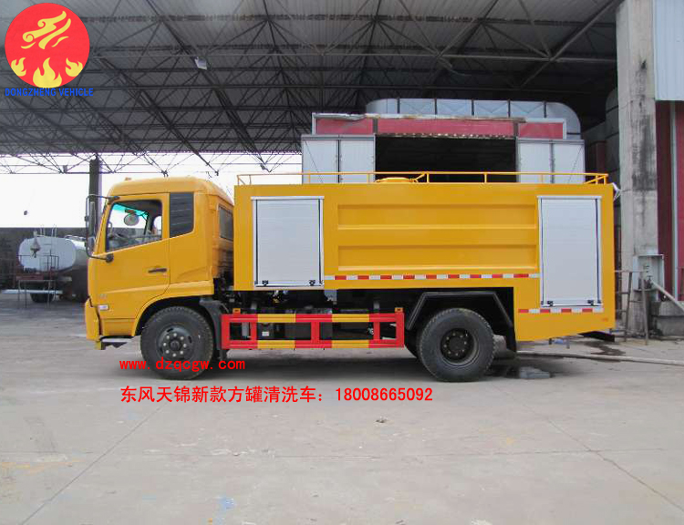 該東風天錦新款方罐清洗車的配置如下:采用3800mm軸距,康機180馬力,內配24Mpa清洗泵,高質量液壓伸縮卷盤。60米高壓管,10個碳鋼噴頭。